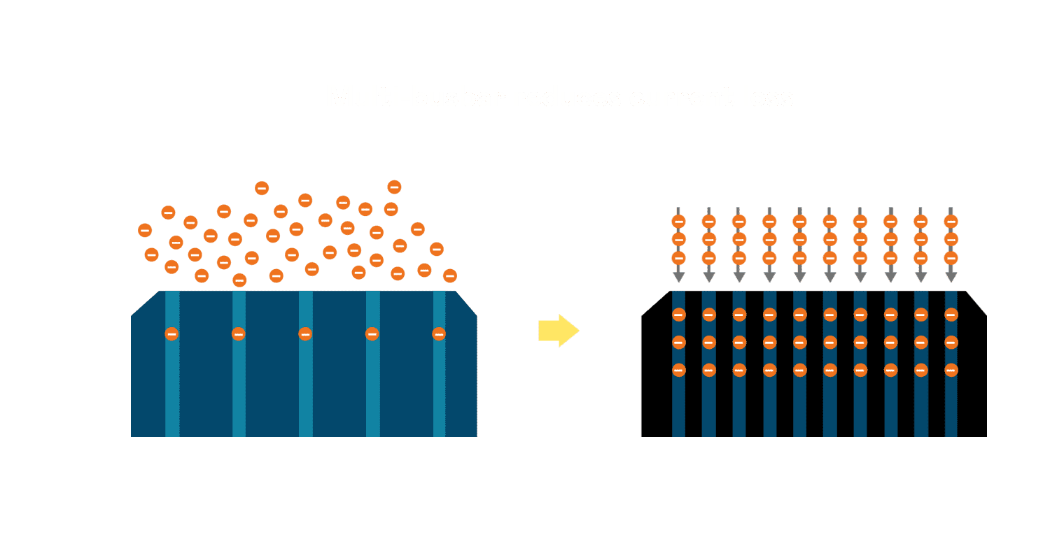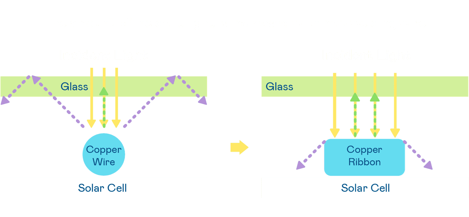 - 电池使用多条铜导线 (Copper wire) 于电池片上形成较短的电流路径,,提高电流收集效率,,,采用圆形设计的铜导线较传统扁平式的铜焊带 (Ribbon),,,,可增加入射至电池的光线量。。。