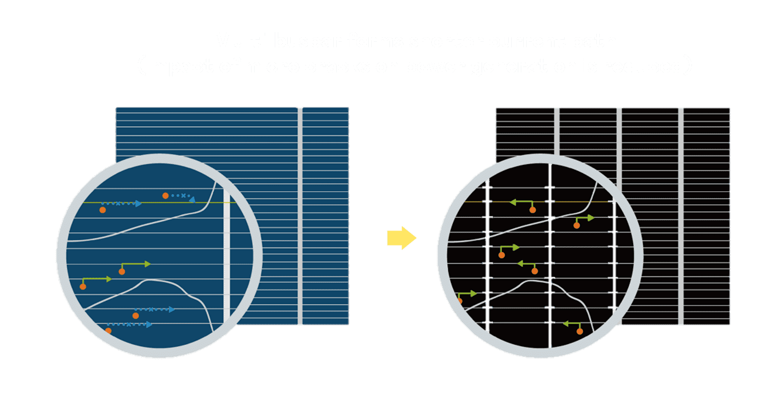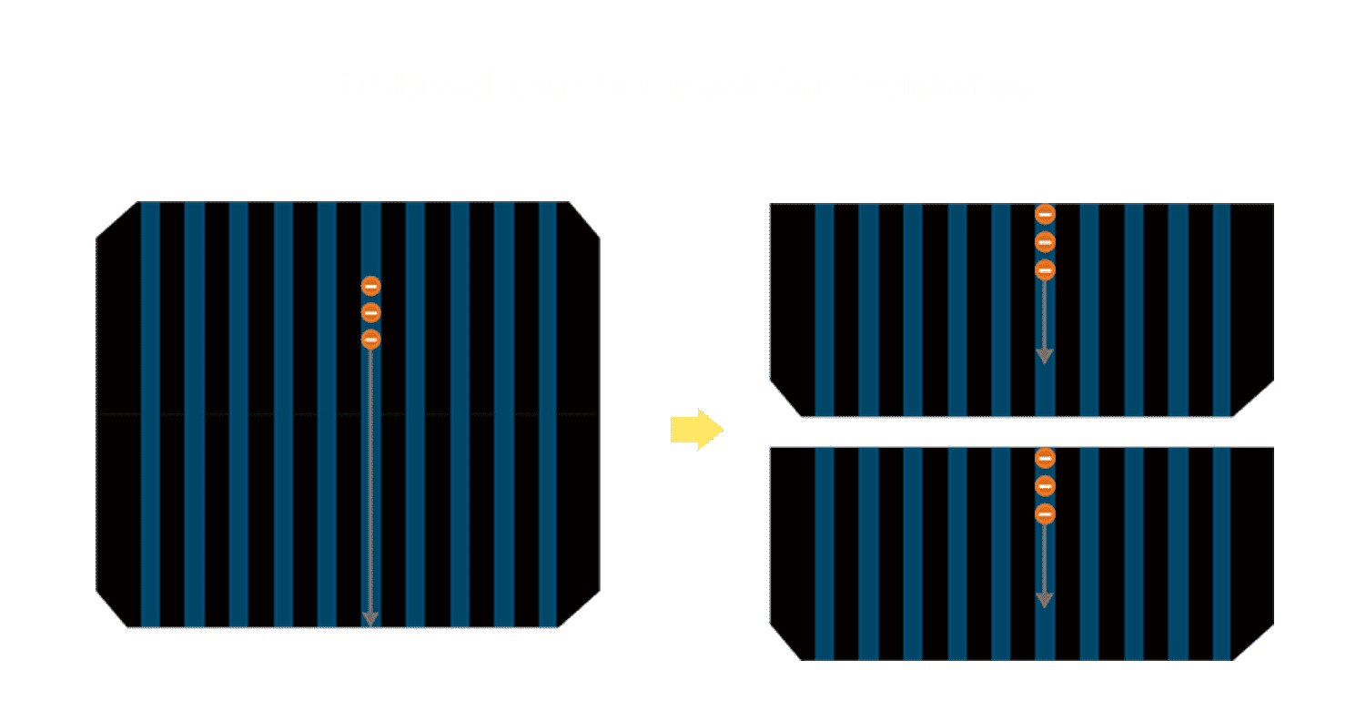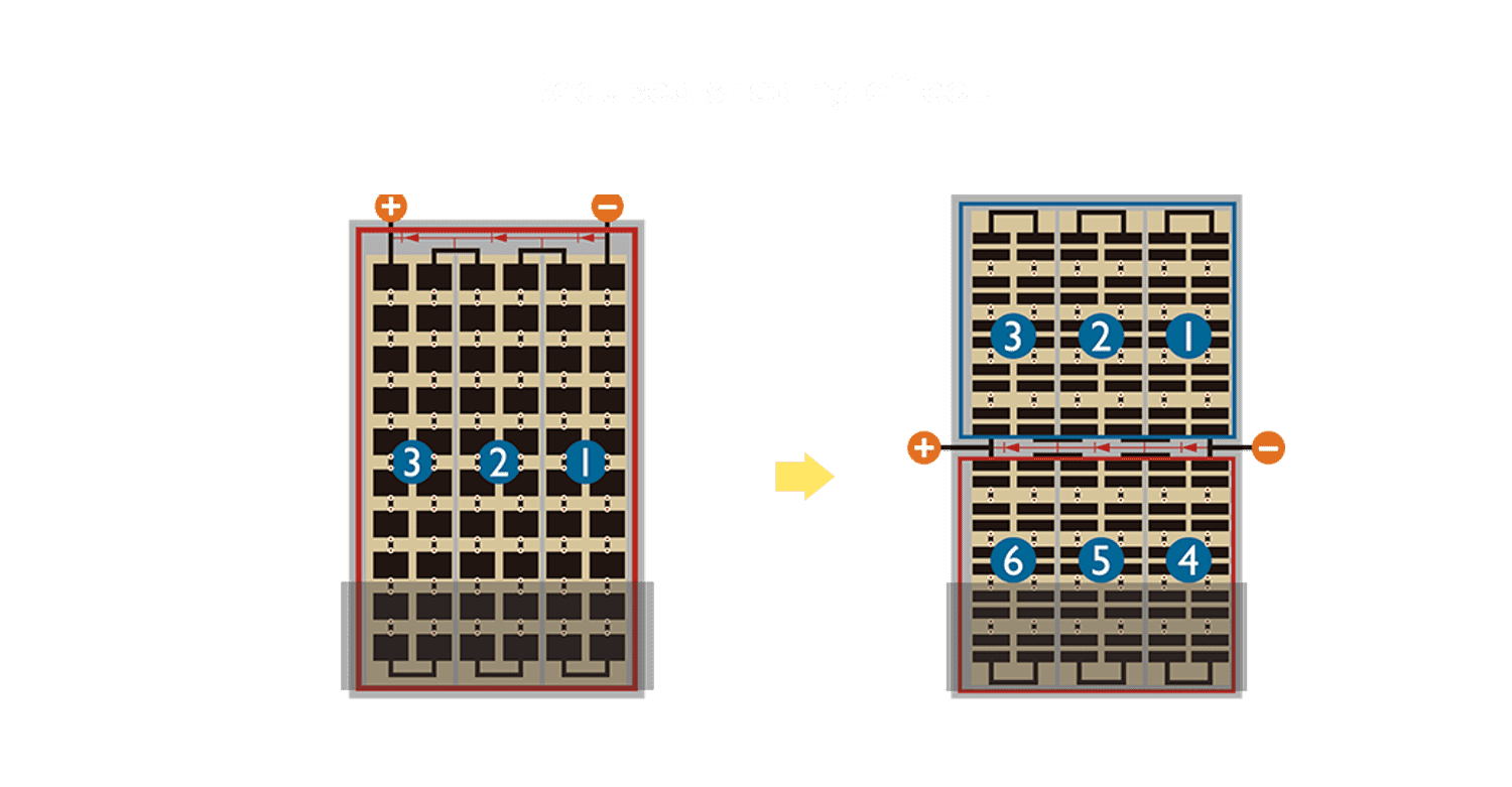 - 结合半切电池,,,,降低遮阴影响、、、提升模组抗隐裂能力、、并减少电阻损耗,,,,进一步提升模组发电效能。。